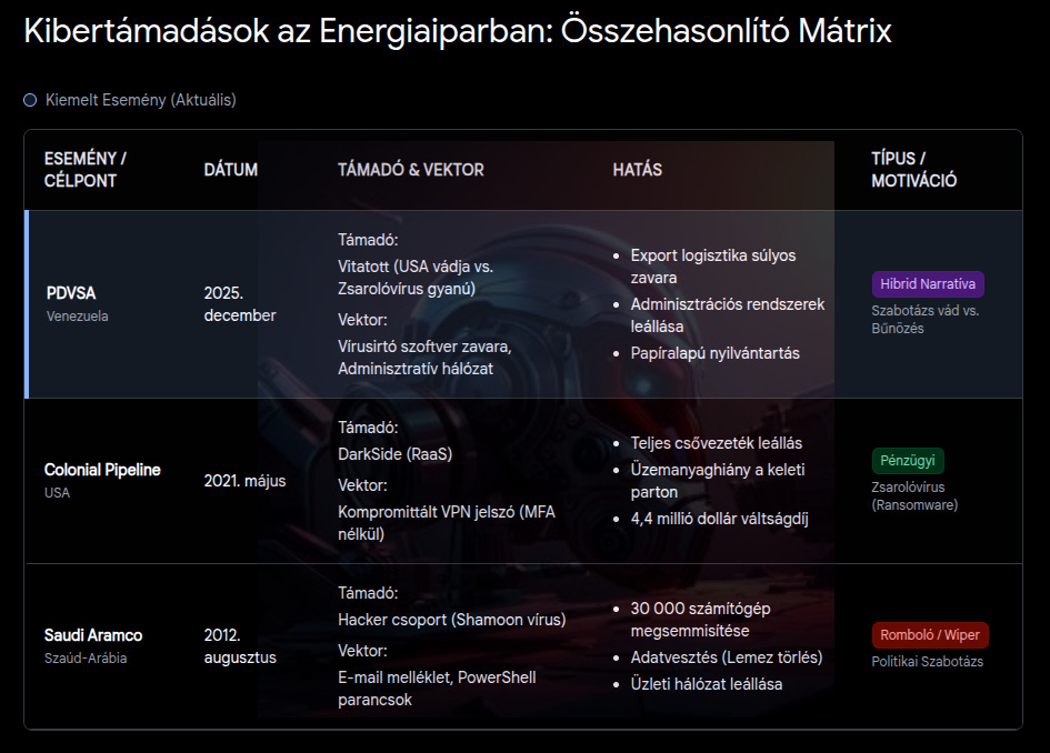 A 2025-ös PDVSA-incidens legközelebbi technikai és operatív analógiája a Colonial Pipeline elleni 2021-es támadás. Bár a politikai kontextus eltérő, a technológiai sebezhetőség és a dominóhatás mechanizmusa kísértetiesen hasonló.