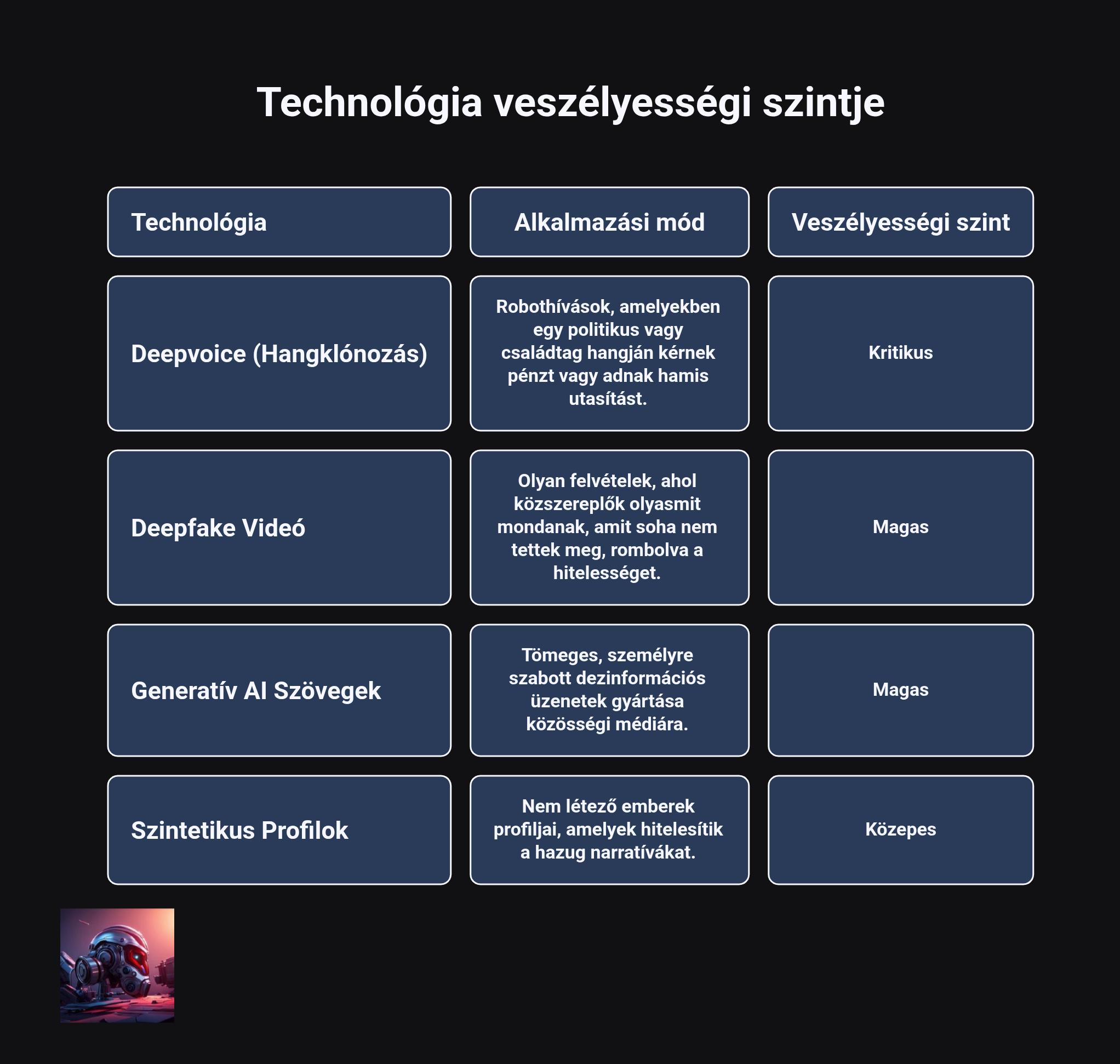 A helyzetet súlyosbítja, hogy a választási kampányokban bevett módszerek, a propaganda, a fake-news, a deepfake és a deepvoice, ma már a dezinformációs kampányok és a kiberbűnözés közös alapkövévé váltak. A szakértői tapasztalatok szerint az ilyen típusú tartalmaknál nem is feltétlenül a tökéletes valósághűség a cél: az információs buborékokban és szekértáborokban élő emberek el akarják hinni azt, amit a saját közösségük állít, így nem kérdőjelezik meg a felvételek valódiságát.