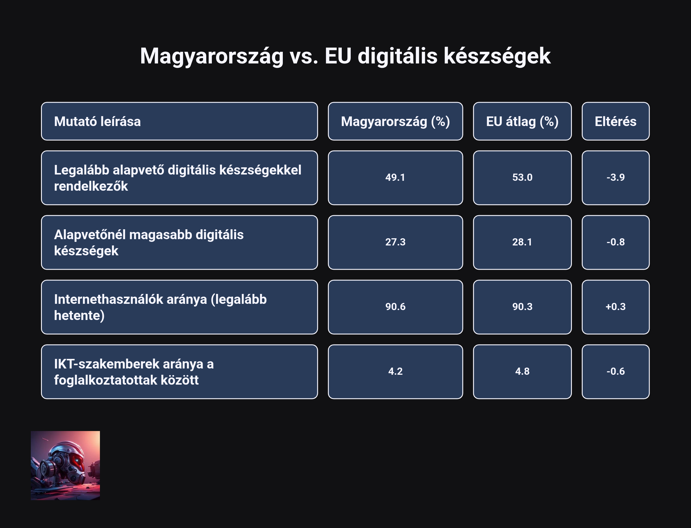 Az adatok rávilágítanak egy kritikus ellentmondásra: miközben a magyar lakosság internethasználati gyakorisága eléri az uniós átlagot, a használat minőségét jelző készségszint jelentősen elmarad attól. Ez a használom, de nem értem állapot a legveszélyesebb a kiberbiztonsági kockázatok szempontjából, mivel hamis biztonságérzetet ad a felhasználónak.