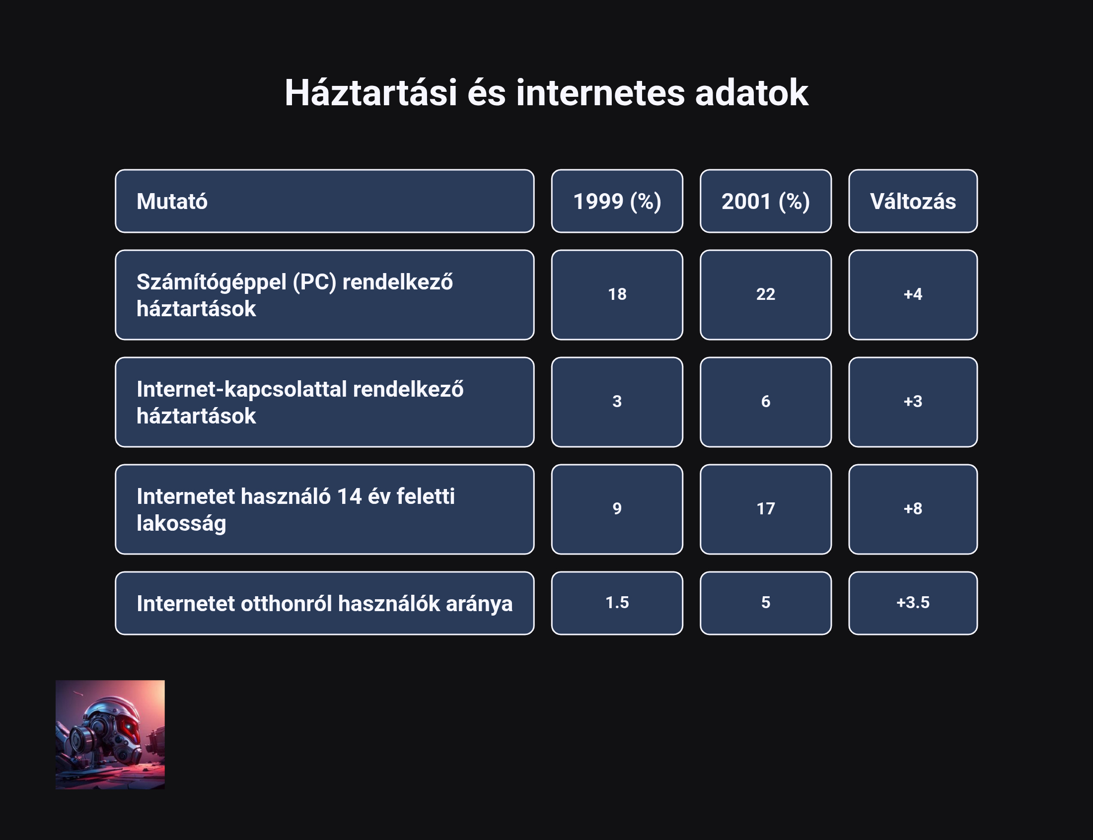 Az adatok jól tükrözik, hogy a technológia beszivárgása a háztartásokba sokkal gyorsabb volt, mint a hálózati integráció. Ez a magányos számítógép korszak alapozta meg azt a későbbi sebezhetőséget, amikor a 2000-es években a mobilinternet és a közösségi média hirtelen, kritikai felkészítés nélkül érte el a társadalmat. A digitális írástudás fejlesztése már ekkor kampányszerű és népszerűsítő jellegű volt, ahelyett, hogy a közoktatás szerves részévé vált volna.