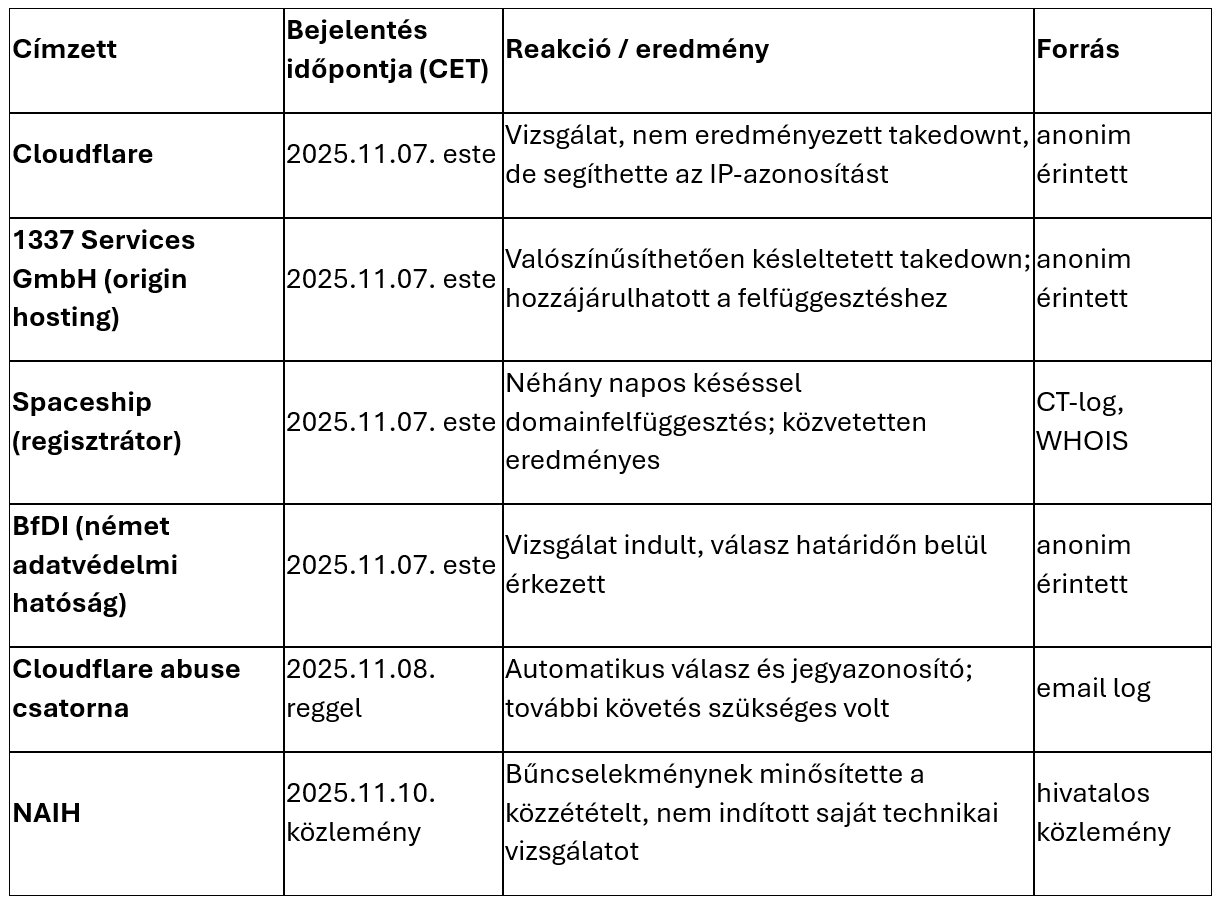 2025. november 7. (19:43–21:13): Az “anonim webfejlesztő” a jogosulatlanul közzétett adathalmazban felismerve a saját adatait, ezzel realizálva az érintettségét az áldozati oldalon, mint az adatvédelmi incidensben érintett, több irányban tesz bejelentést: a tárhelyszolgáltatóhoz (1337 Services), a domainregisztrátorhoz (Spaceship), a német adatvédelmi hatósághoz (BfDI) és a DNS-szolgáltatóhoz (Cloudflare).