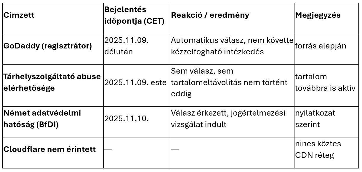 A válaszlépések – például a NAIH közleménye, az abuse contact pontokra történő bejelentések, illetve a magyar internetszolgáltatók szűrési intézkedései – szintén viszonylag rövid idő alatt megtörténtek. Ugyanakkor az incidens dinamikája azt mutatja, hogy az oldal üzemeltetői gyorsan alkalmazkodtak: az új domainregisztrációk és a tárhelyszolgáltató-váltások révén néhány órán belül képesek voltak második platformot indítani.