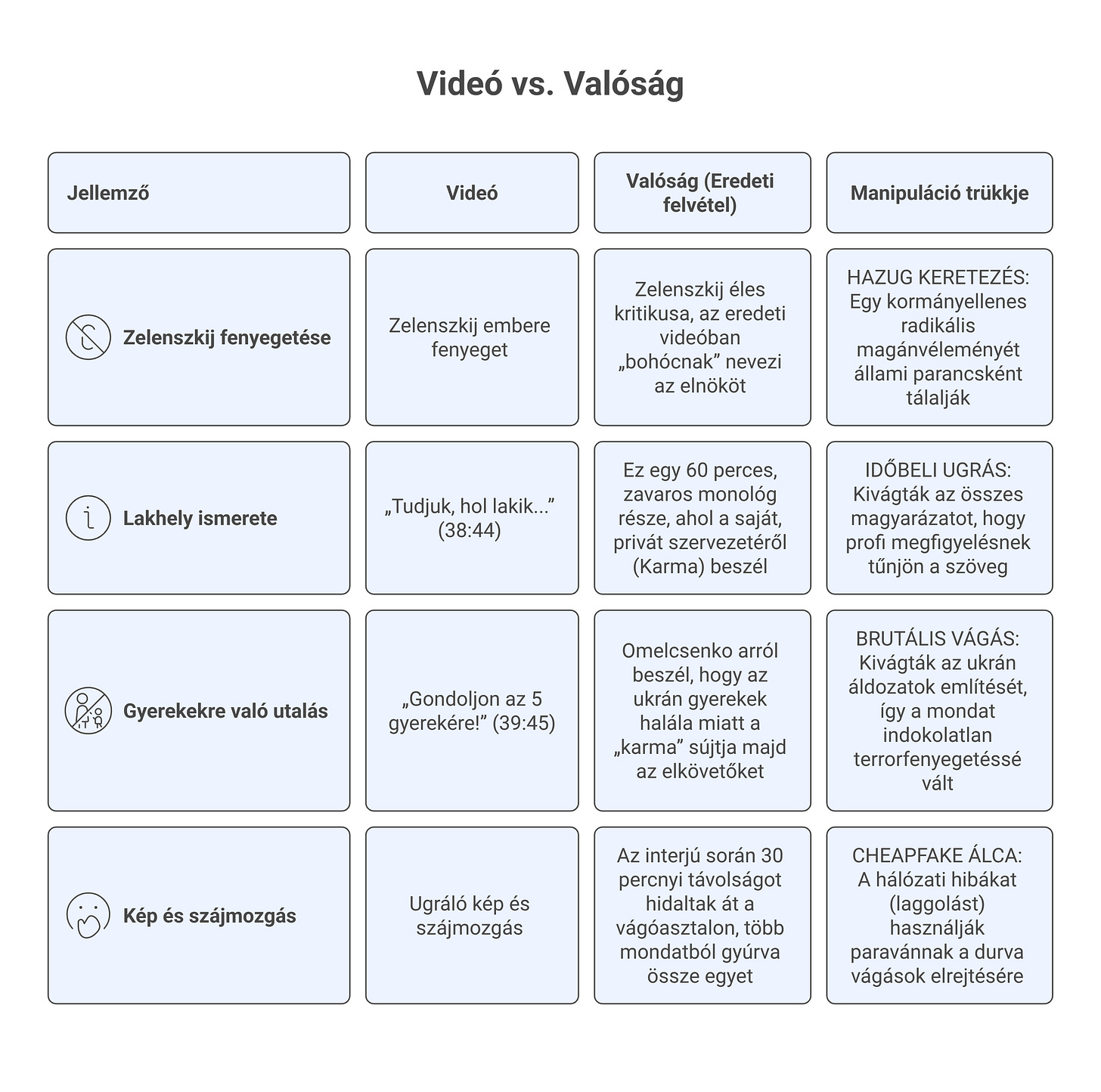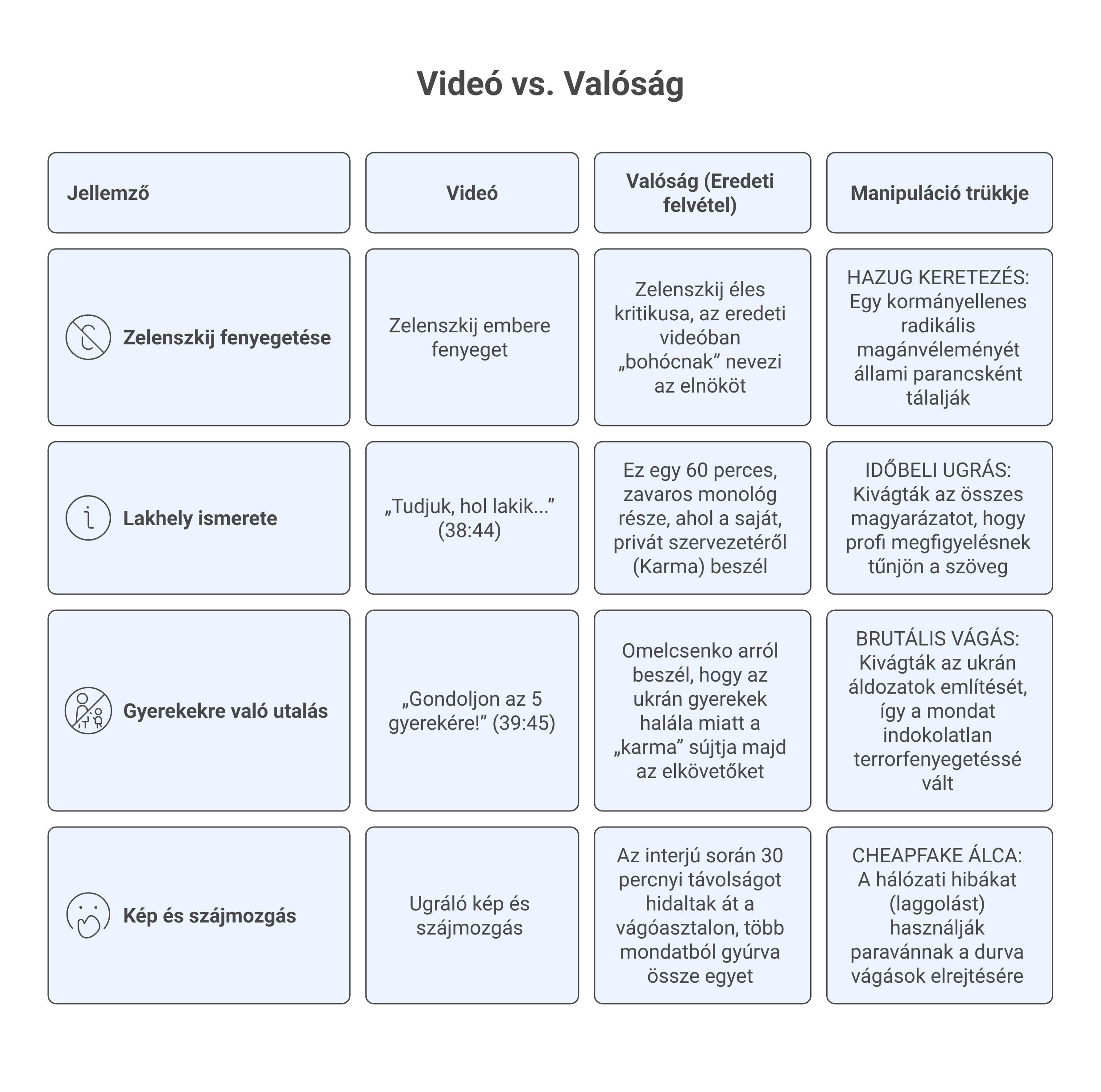 Tartalmi torzítás: Az elemzés megmutatta, hogy Omelcsenko eredeti, karmikus átokról szóló fejtegetését a vágások segítségével közvetlen fizikai/terrorista fenyegetéssé alakították át a kontextus (pl. az ukrán gyerekáldozatok említésének) tudatos törlésével.